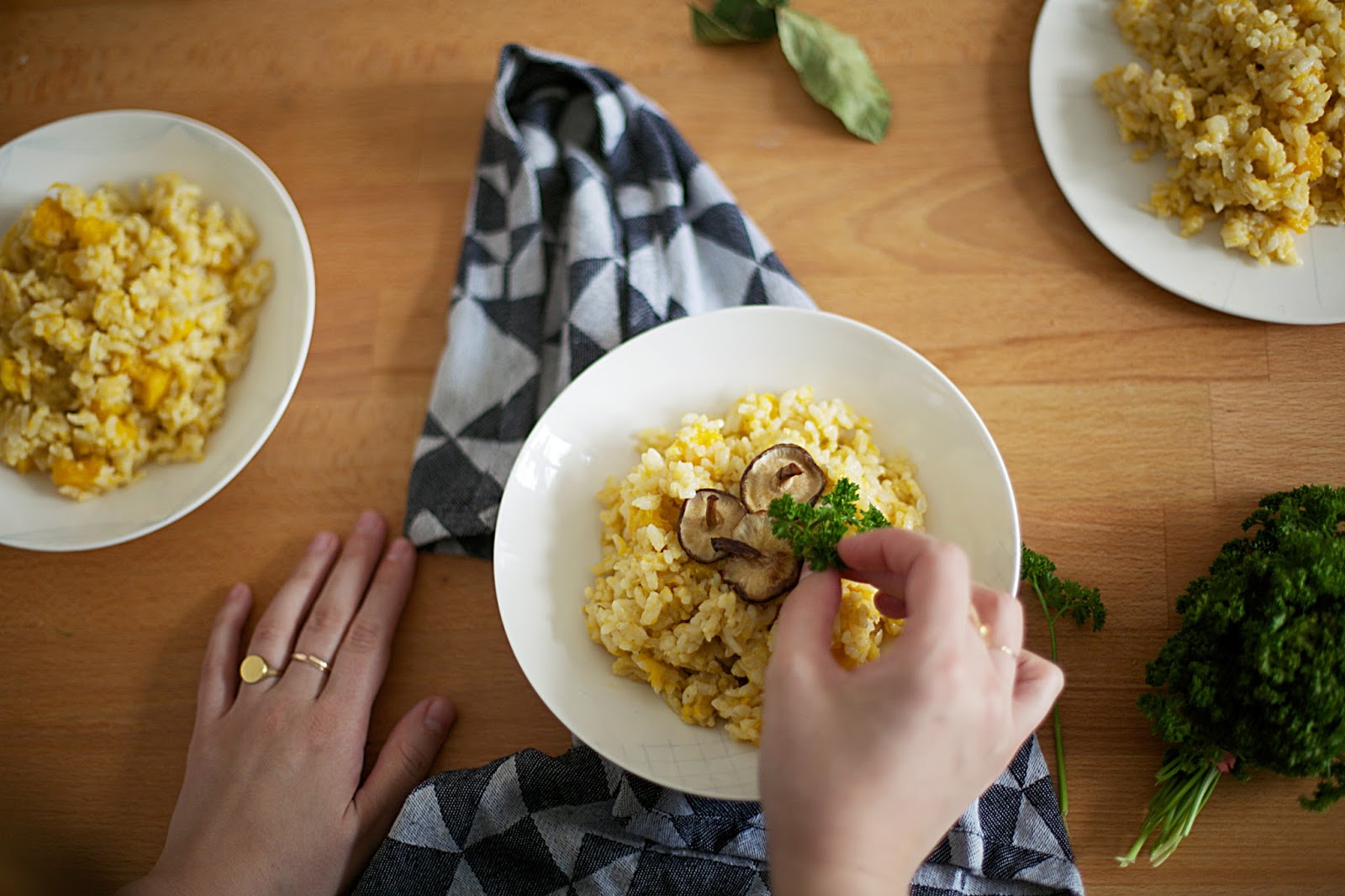 kürbis putzen (kerne mit einem löffel entfernen) und in etwa 1cm kleine würfel schneiden. den kürbis in den topf geben, umrühen und für 5min auf kleiner flamme lassen. etwas gemüsebrühe hinzufügen und sobald der kürbis schön saftig ist, den reis hinzufügen (zu diesem zeitpunkt sollte nicht viel flüssigkeit im topf sein). für etwa 10min regelmäßig rühren. dieser schritt ist wichtig damit der reis mehr geschmack bekommt. nun hin und wieder etwas brühe hinzugeben und rühren. zu dem zeitpunkt, wenn du nun